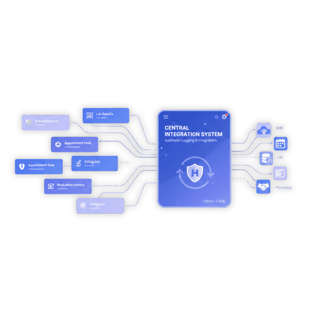 Plugs into the systems you already use." Body: "Direct integration with your PMS, CRM, or EMR. Every call logged automatically. Appointments synced in real time. No double entry. No manual updates. HIPAA compliant with signed BAA.
