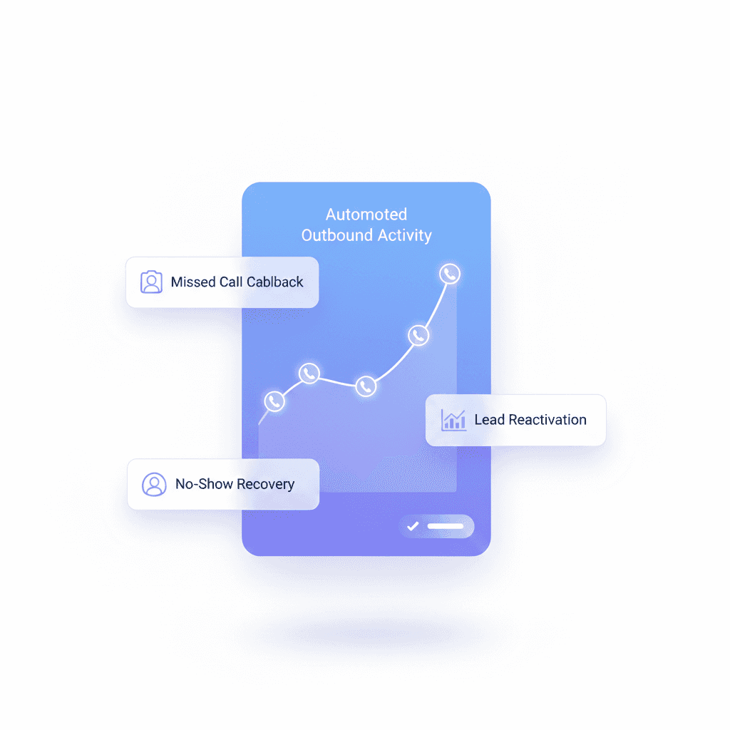 Dormant patients called back. Empty slots filled." Body: "Automated outbound to missed callers, no-shows, and lapsed patients. Books directly into open slots. Zero staff time.